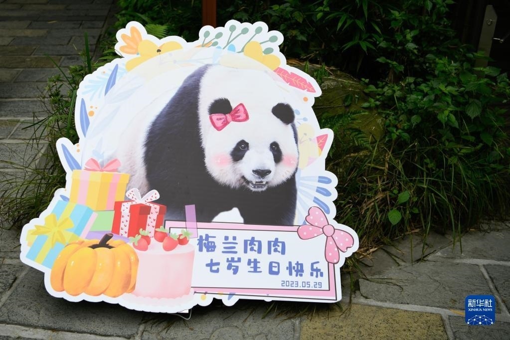 這是5月29日在成都大熊貓繁育研究基地都江堰野放繁育研究中心拍攝的市民為梅蘭布置的生日裝飾。   新華社記者 胥冰潔 攝
