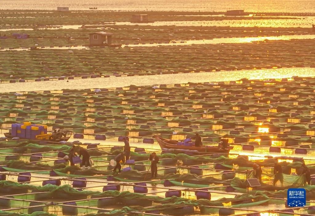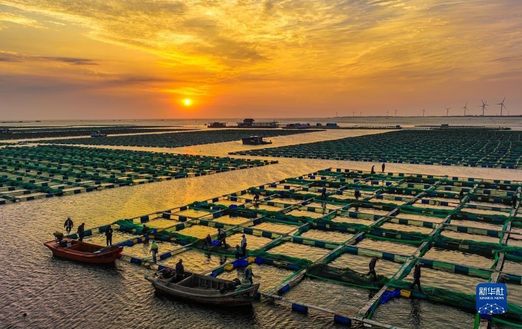 6月5日,在榮成市石島管理區(qū)桑溝灣海洋牧場生態(tài)網(wǎng)箱養(yǎng)殖區(qū),漁民在進行海上養(yǎng)殖作業(yè)(無人機照片)。