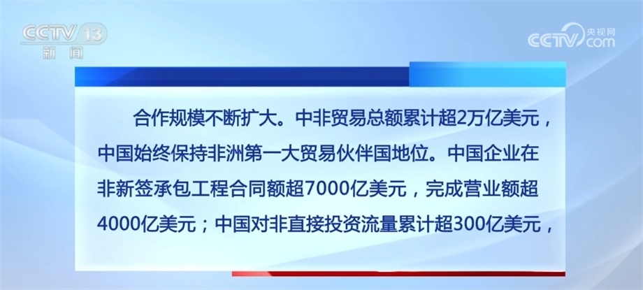 合作規(guī)模不斷擴大。中非貿(mào)易總額累計超2萬億美元,中國始終保持非洲第一大貿(mào)易伙伴國地位。中國企業(yè)在非新簽承包工程合同額超7000億美元,完成營業(yè)額超4000億美元;中國對非直接投資流量累計超300億美元,已成為非洲第四大投資來源國;向非洲國家派遣醫(yī)療隊員約9000人次,提供研修培訓(xùn)名額超過10萬個,一批基礎(chǔ)設(shè)施和社會民生項目相繼建成。