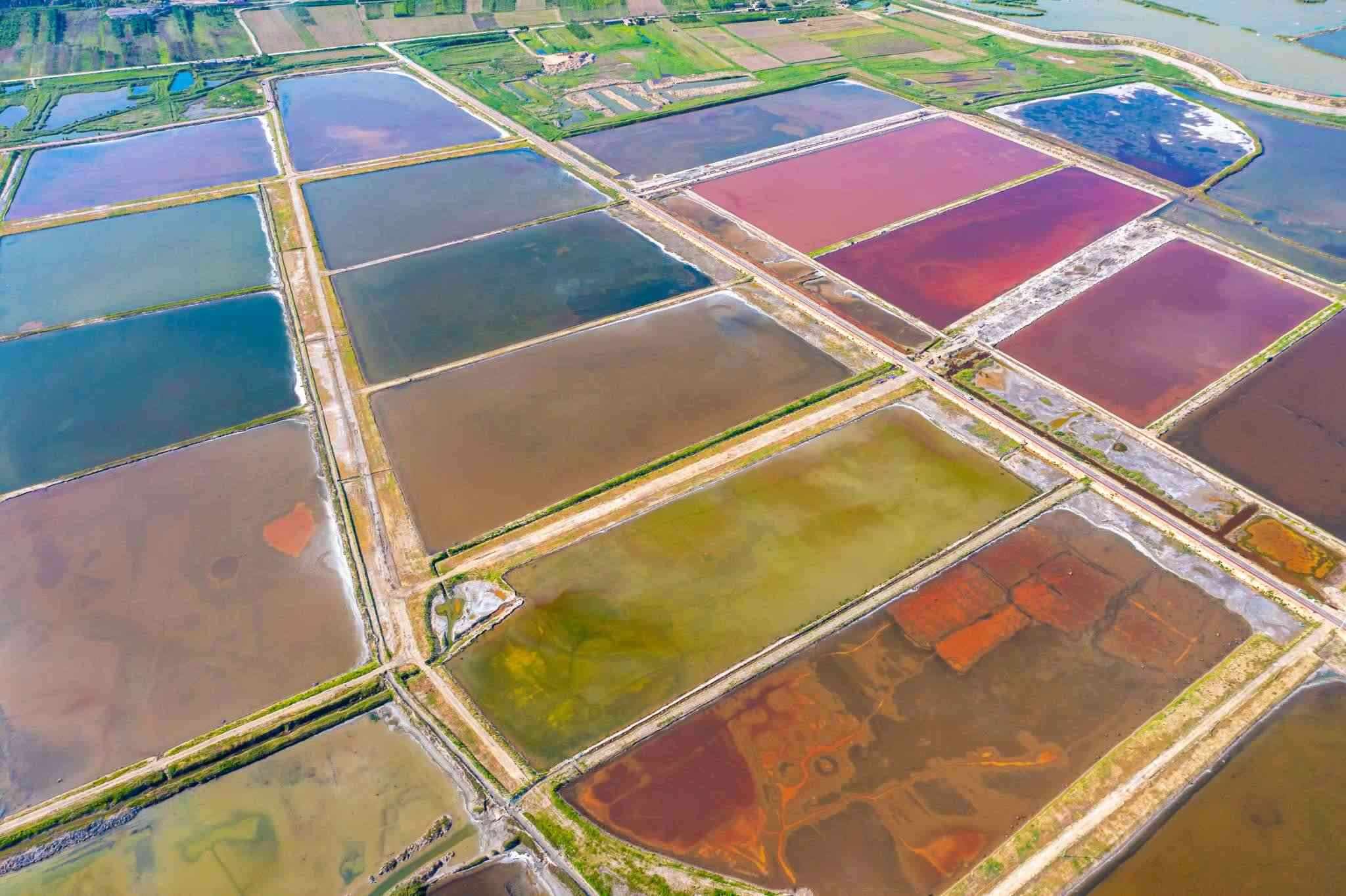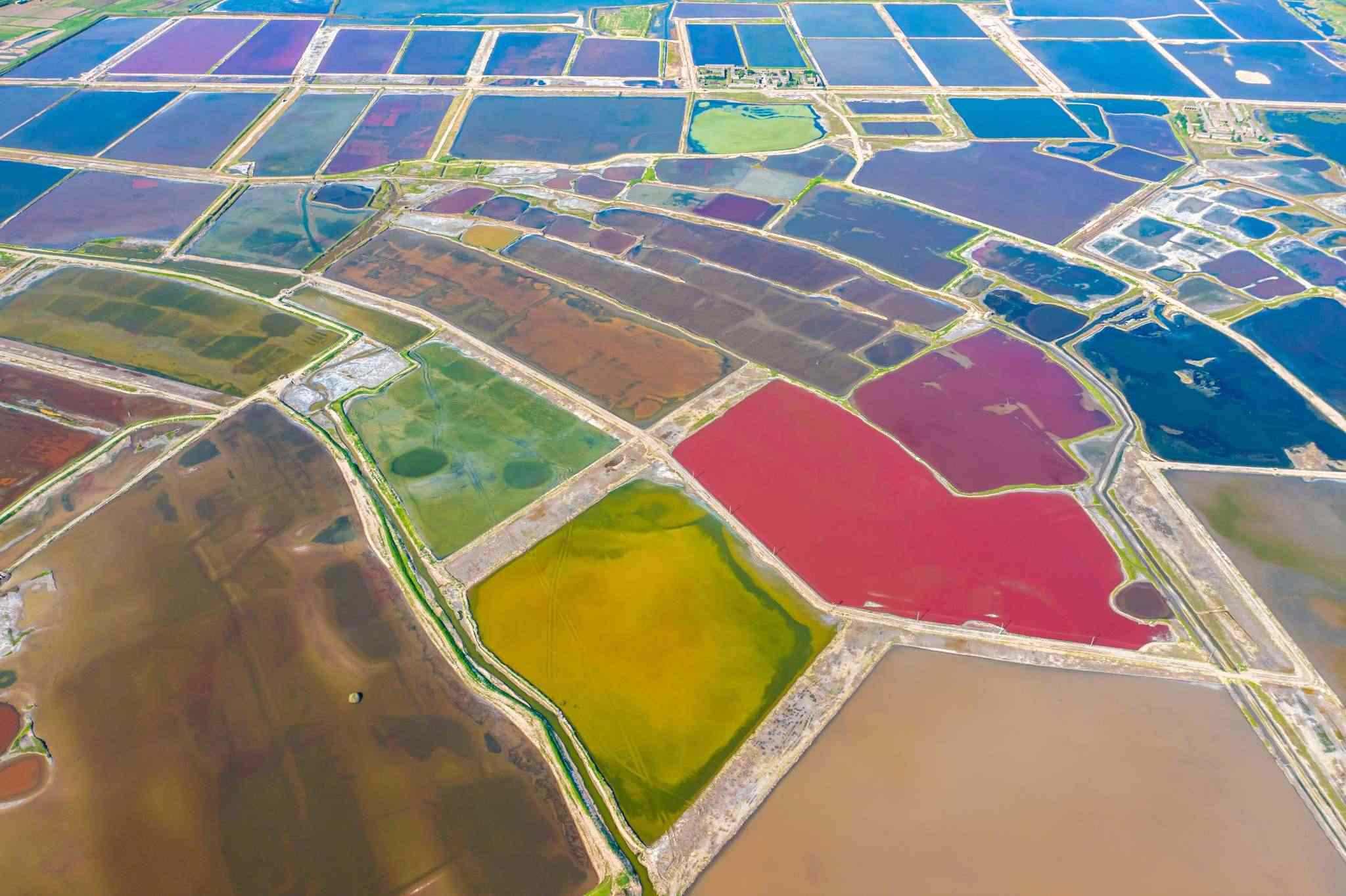 2023年6月14日,山西運城,七彩鹽湖呈現(xiàn)出色彩斑斕的景觀,猶如大地調色板,美不勝收。視覺中國