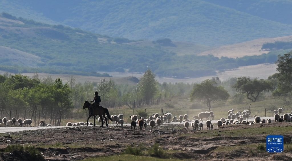 6月14日,在阿魯科爾沁草原,牧民騎馬放牧。