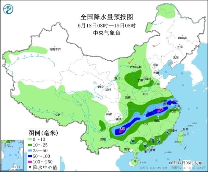 17日至19日,西南地區(qū)東部、江漢、江淮、江南、華南等地有大范圍較強(qiáng)降雨過(guò)程,部分地區(qū)有大到暴雨,局地大暴雨,并伴有短時(shí)強(qiáng)降水、雷暴大風(fēng)等強(qiáng)對(duì)流天氣。其中,6月17日08時(shí)至18日08時(shí),江淮大部、江漢大部、湖南北部、重慶中東部、貴州北部、廣西北部和南部沿海、廣東中南部、福建南部以及西藏東南部、云南西北部等地部分地區(qū)有大到暴雨,其中,湖北東部、重慶東南部、貴州東北部、廣東中南部等地部分地區(qū)有大暴雨(100~150毫米)。上述部分地區(qū)伴有短時(shí)強(qiáng)降水(最大小時(shí)降雨量20~60毫米,局地可超過(guò)70毫米),局地有雷暴大風(fēng)等強(qiáng)對(duì)流天氣。中央氣象臺(tái)6月17日06時(shí)繼續(xù)發(fā)布暴雨藍(lán)色預(yù)警。