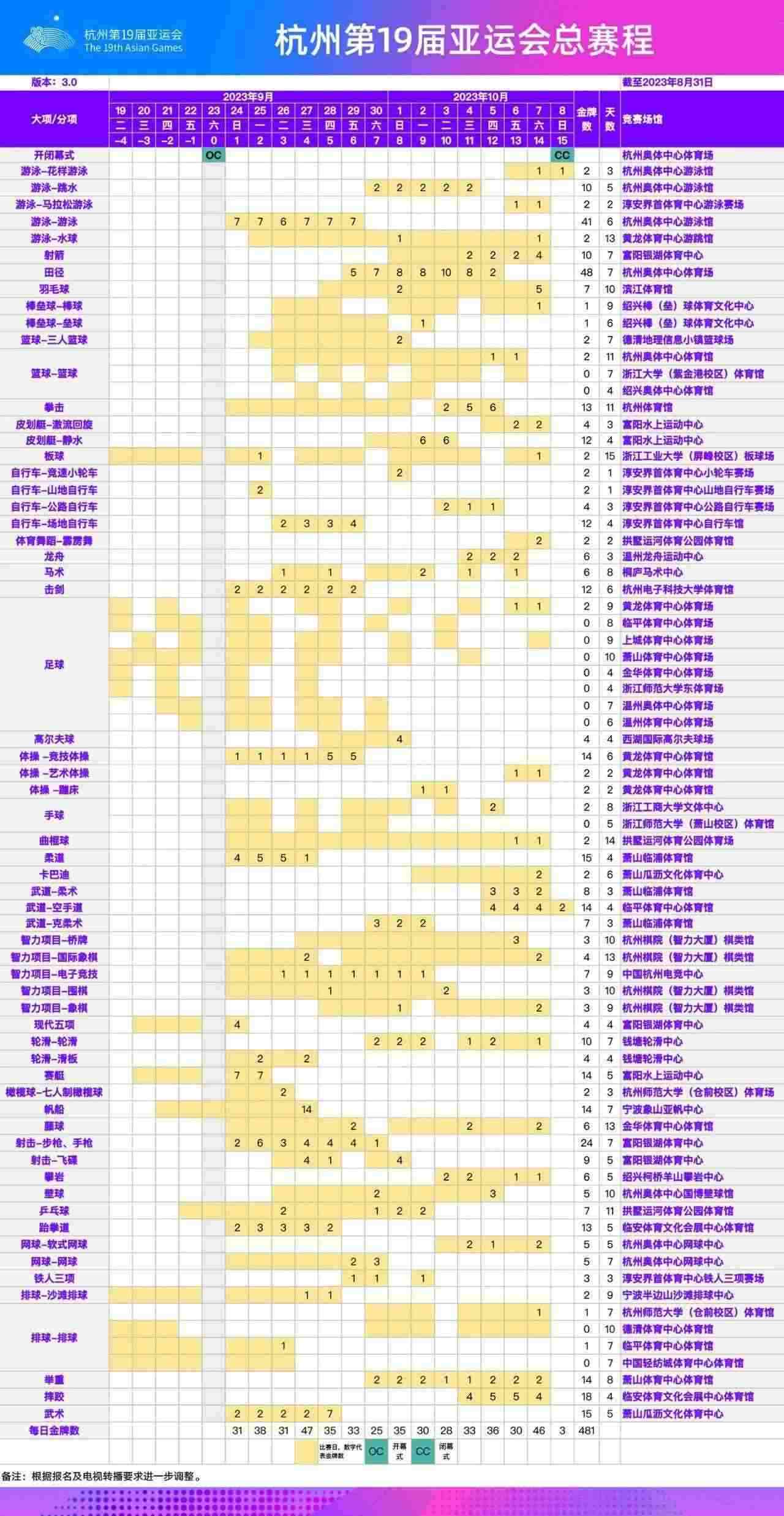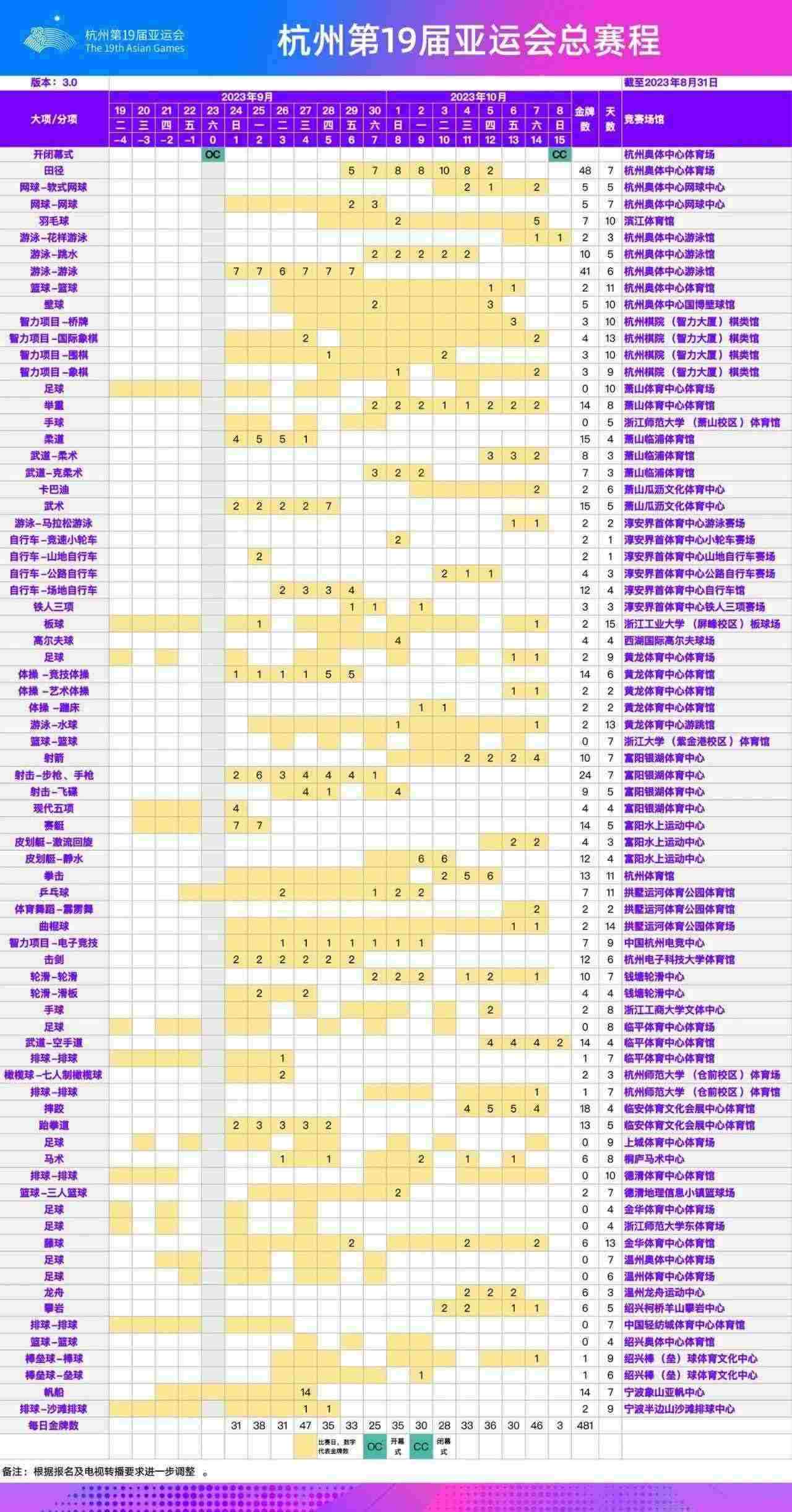 根據(jù)最新報名調(diào)整情況,經(jīng)杭州亞運會各項目技術(shù)代表確認(rèn),杭州亞運會總賽程已更新至3.0版。