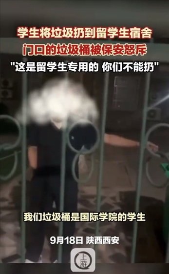 ·西安交大學(xué)生用留學(xué)生宿舍垃圾桶遭保安怒斥,學(xué)校回應(yīng):會(huì)對(duì)相關(guān)人員進(jìn)行批評(píng)教育。