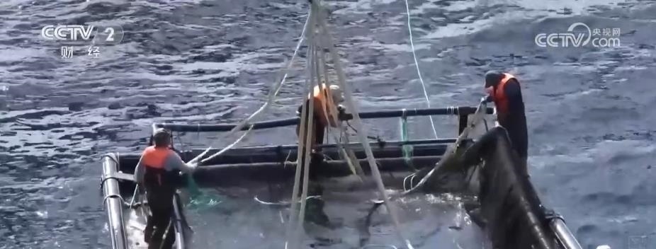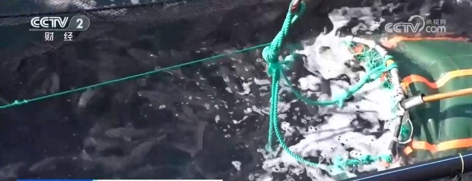 在煙臺長島南隍城海域,隨著經(jīng)海系列深水網(wǎng)箱里魚類的成熟,一場在大海上的收獲正在進行。起降機將一個個裝滿魚兒的巨大網(wǎng)兜轉(zhuǎn)移到運輸船上,2.5萬尾近4萬斤的成品黑鲪魚,將從這里銷往全國各地。