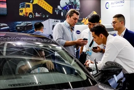 △今年4月15日,采購商在廣交會新設(shè)置的新能源及智能網(wǎng)聯(lián)汽車展區(qū)了解中國新能源汽車產(chǎn)品。