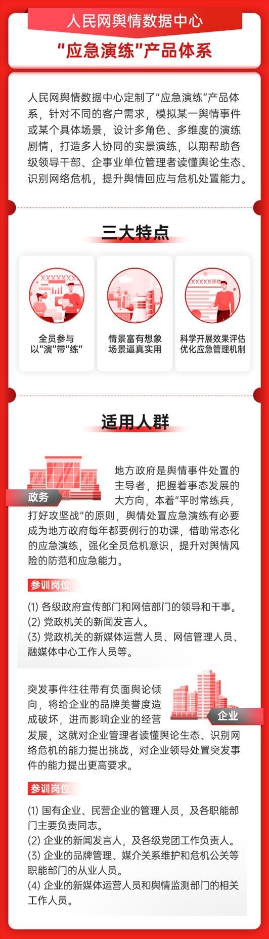 近日,人民網(wǎng)輿情數(shù)據(jù)中心全面升級“突發(fā)事件輿情處置應急演練體系”,旨在幫助各級領導干部、企事業(yè)單位管理者進一步讀懂新形勢下輿論生態(tài)、科學研判網(wǎng)絡事件,提升輿情回應與應急處置能力。