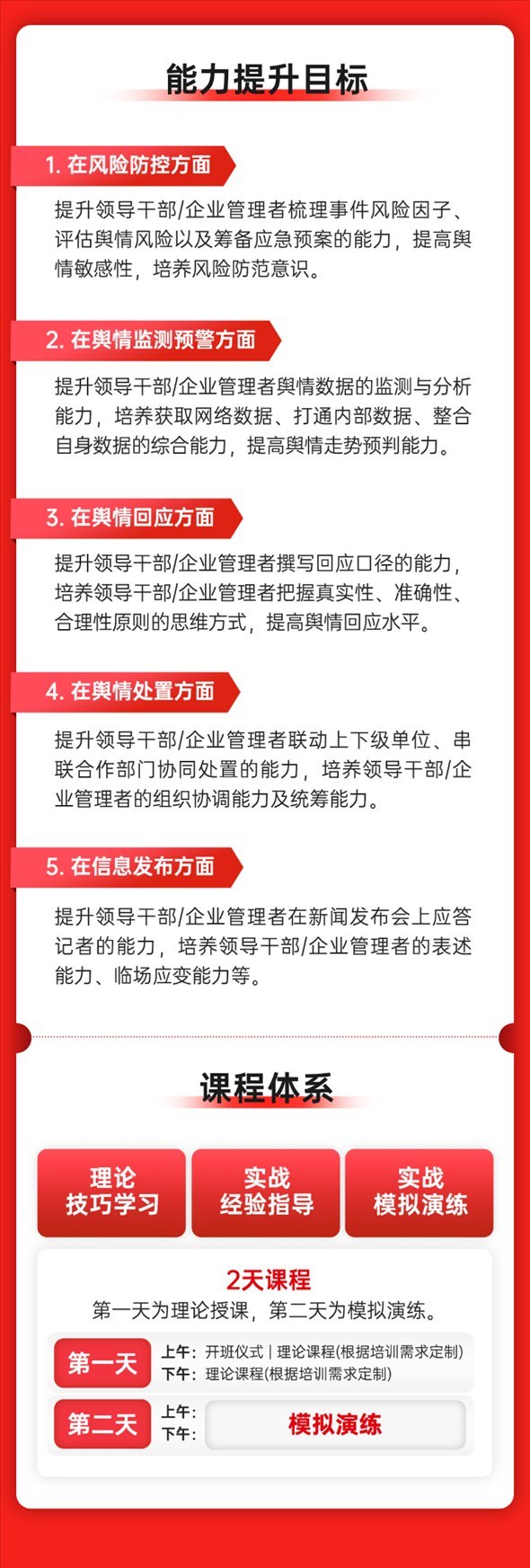 “突發(fā)事件輿情處置應急演練體系”可針對不同需求,模擬某一輿情事件或某個具體場景,通過多角色、多維度的模擬設計,打造多人協(xié)同的實景演練。該體系通過以“演”帶“練”的方式,把書面應急預案進行實際模擬預演,檢驗應急預案的合理性與實效性;通過逼真的模擬設計,真實還原輿論沖突處置過程,提高演練針對性和實戰(zhàn)性;通過復盤與總結,對演練效果進行科學評估和點評,持續(xù)提升參訓人員突發(fā)事件輿情處置經驗、處置能力,優(yōu)化輿情處置預案、處置環(huán)節(jié)。