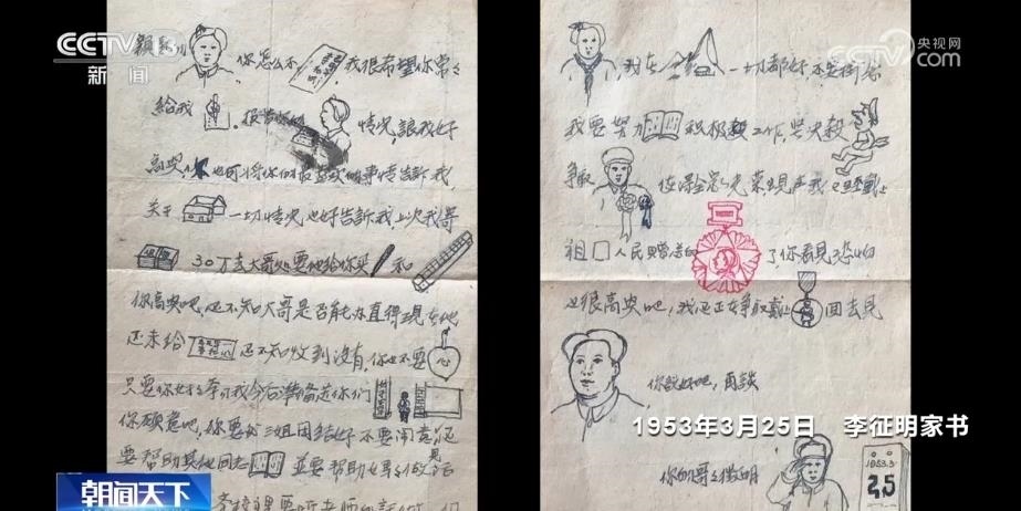 這是一封1953年3月25日從抗美援朝戰(zhàn)場(chǎng)發(fā)往江蘇宿遷的信。在這封戰(zhàn)地家書(shū)中,志愿軍戰(zhàn)士李征明為未來(lái)的奮斗目標(biāo)做出規(guī)劃。因?yàn)槊妹脗兊哪挲g還很小、識(shí)字不多,李征明擔(dān)心她們看不懂,就在信中畫(huà)上了許多圖文并茂的小畫(huà)。