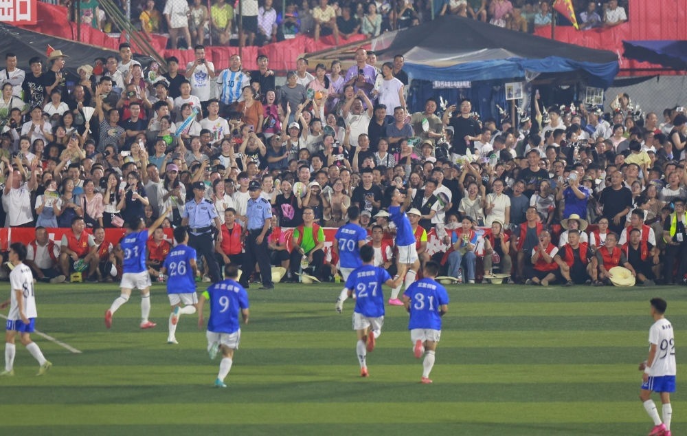 29日晚“村超”決賽現(xiàn)場(chǎng),榕江縣車江一村與忠誠村展開了冠軍爭(zhēng)奪。比賽開場(chǎng)不到3分鐘,雙方便各攻入一球,決賽的氣氛瞬間被點(diǎn)燃。