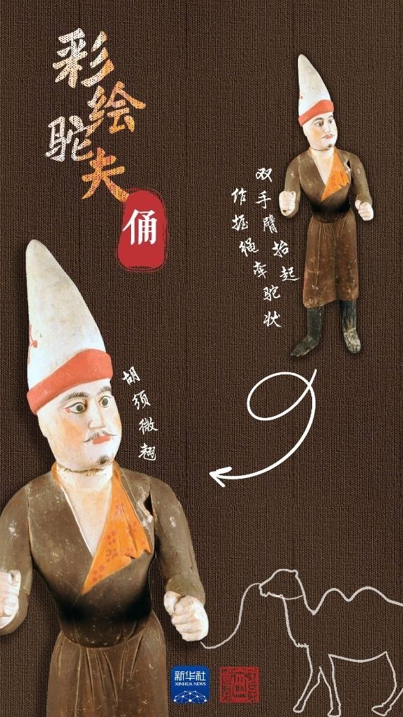 吐魯番阿斯塔那206號墓是唐代高昌左衛(wèi)大將軍張雄與妻子的合葬墓。墓中出土的木俑做工精湛,大多是由中原生產,具有明顯的盛唐風格,彩繪駝夫俑便出土于此。駝夫為胡人男子形象,深目高鼻,胡須微翹,頭戴高聳折沿白氈尖帽,身著褐色掩襟長袍,足穿高棱黑靴。此俑為分段雕刻膠合而成,再施以彩繪,面部表情富有神韻,惟妙惟肖。通過駝夫生動的神情仿佛看到他牽著駱駝,帶著各色商品,沿著絲綢之路慢慢走來。
