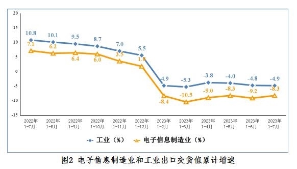 1—7月份,規(guī)模以上電子信息制造業(yè)出口交貨值同比下降8.3%,降幅較上半年收窄0.9個百分點,比同期工業(yè)降幅深3.4個百分點。7月份,規(guī)模以上電子信息制造業(yè)出口交貨值同比下降5.1%。