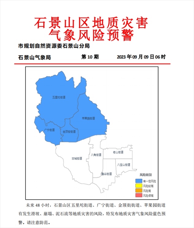石景山區(qū)五里坨街道、廣寧街道、金頂街街道、蘋果園街道有發(fā)生滑坡、崩塌、泥石流等地質(zhì)災(zāi)害的風(fēng)險,特發(fā)布地質(zhì)災(zāi)害氣象風(fēng)險藍色預(yù)警。請注意防范。