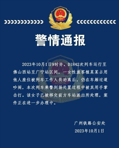 ·廣州警方通報(bào)女子高鐵占座掌摑乘警:已被移交派出所處理。