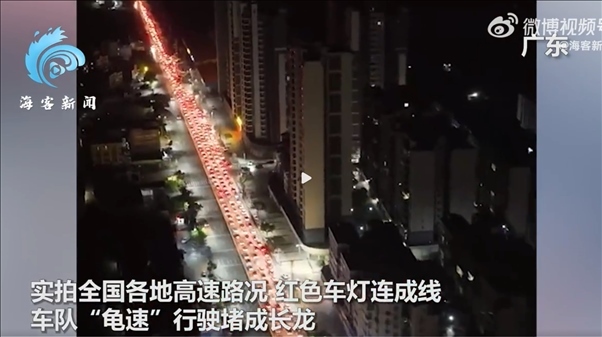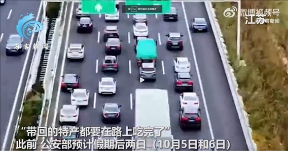 據(jù)??托侣劰俜轿⒉?,10月4日,中秋國慶假期進(jìn)入第6天,多地陸續(xù)迎來返程高峰。實(shí)拍全國各地高速路況,紅色車燈連成線,車隊(duì)“龜速”行駛堵成長龍。有網(wǎng)友曬出高速路況畫面表示“特意提前三天回去,沒想到又堵路上了?!薄ⅰ?strong>帶回的特產(chǎn)都要在路上吃完了”。