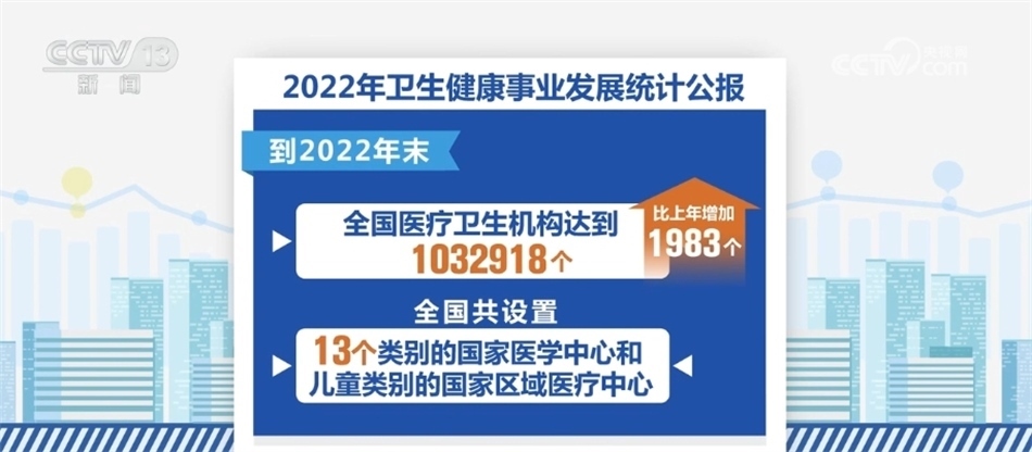 《公報(bào)》顯示,我國醫(yī)療衛(wèi)生資源總量繼續(xù)增加。到2022年末,全國醫(yī)療衛(wèi)生機(jī)構(gòu)達(dá)到1032918個,比上年增加1983個。全國共設(shè)置13個類別的國家醫(yī)學(xué)中心和兒童類別的國家區(qū)域醫(yī)療中心。全國醫(yī)療衛(wèi)生機(jī)構(gòu)床位975.0萬張,每千人口醫(yī)療衛(wèi)生機(jī)構(gòu)床位數(shù)由2021年的6.70張?jiān)黾拥?022年的6.92張。全國衛(wèi)生人員總數(shù)1441.1萬人,比上年增加42.5萬人。每千人口執(zhí)業(yè)(助理)醫(yī)師3.15人,每千人口注冊護(hù)士3.71人。