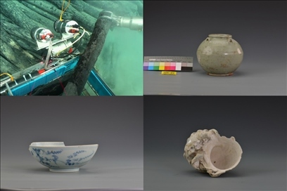 一號(hào)沉船遺址有多個(gè)隔艙的船貨堆積,包括陶器、瓷器、銅器、鐵器、竹木器等,數(shù)量超十萬(wàn)件,代表性器物有醬釉陶罐,琺華梅瓶,青花執(zhí)壺、玉壺春瓶,紅綠彩碗、盤、杯,青釉玉壺春瓶,青白釉盤、碗,白釉三足圓香爐,藍(lán)釉高足碗,單色釉玉壺春瓶、扁壺,素三彩螺形壺、象形壺、鶴形壺,鐵鍋,銅盤、銅錢等。二號(hào)沉船遺址發(fā)現(xiàn)大量尺寸相近、碼放整齊的原木及少量陶器、瓷器、蠑螺殼等。