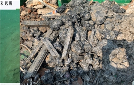一號(hào)沉船遺址由核心區(qū)、環(huán)形散落區(qū)和條形散落區(qū)組成,年代為明正德年間。核心區(qū)為船體和大量堆疊有序、碼放整齊的陶瓷器、鐵器等構(gòu)成的堆積,長(zhǎng)約37米,寬約11米,環(huán)形散落區(qū)、條形散落區(qū)由散落的船載物品構(gòu)成,遺物較少。一號(hào)沉船上部結(jié)構(gòu)不存,殘存船體大部分被掩埋覆蓋,僅在部分位置暴露有隔艙板和底板。