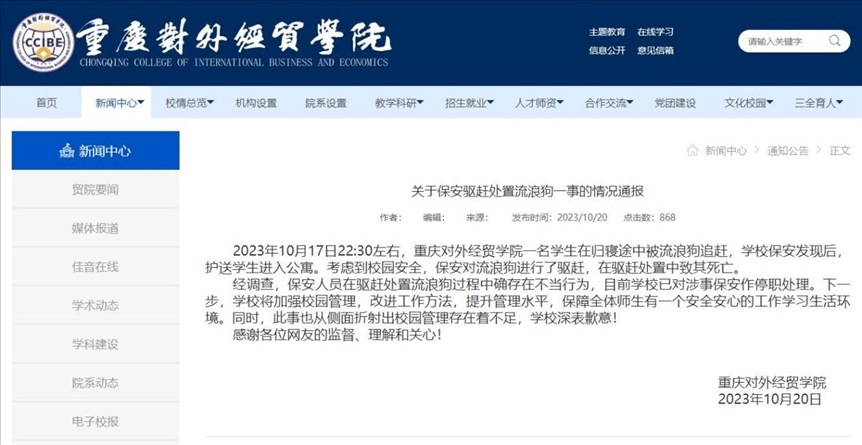 ·重慶對外經(jīng)貿(mào)學(xué)院通報(bào)“流浪狗被保安驅(qū)趕處置致死”:涉事保安停職。