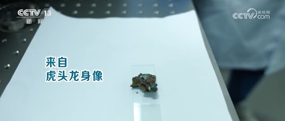 四川省文物考古研究院館員 肖慶:這件樣品是從8號坑的虎頭龍身像上取下來的樣品。這件器物的特別之處就是在它的底座上,有很多紅顏色類似顏料樣的東西?,F(xiàn)在要做的就是來確定這個紅色的顏料到底是什么物質(zhì)。