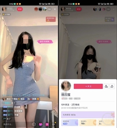 在另一社交平臺中,面容姣好、標簽為“大學(xué)生”的女主播“丫頭XXX”在23日凌晨1點過仍在直播,她和一位上了年紀的男性連麥互動,直播間標簽寫著“穿云箭帶走、啤酒俯臥撐、私人**任你、喜歡你進裙”。