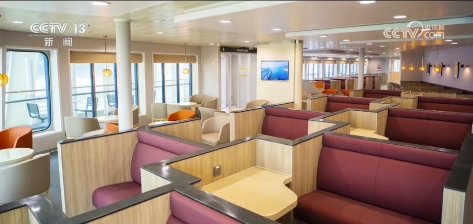 中國船舶廣船國際客滾船大項目經理 李會倫:這艘船采用雙頭設計,進出港不用調頭,船員可分別在兩個駕駛室駕駛這艘船,因此可以節(jié)省大量進出港時間。船上共配備了1160塊大容量電池,電池裝船容量達到8.8兆瓦時,相當于150輛電動汽車的電池容量之和,可在近海航行時采用全電力推進,實現(xiàn)零排放。
