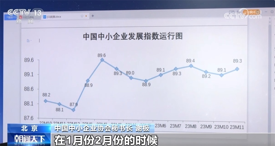 總臺央視記者 王雷:2023年的中國中小企業(yè)發(fā)展指數(shù)總體呈現(xiàn)出波浪式上升的走勢。通過對數(shù)據(jù)的分析,我們還發(fā)現(xiàn),隨著眾多中小企業(yè)加快產(chǎn)業(yè)、產(chǎn)品升級,它們的競爭力也在不斷增強(qiáng)。對比去年11月份和今年11月份的數(shù)據(jù),宏觀經(jīng)濟(jì)感受指數(shù)是分項指數(shù)中升幅最大的,一共上升了2.5點。