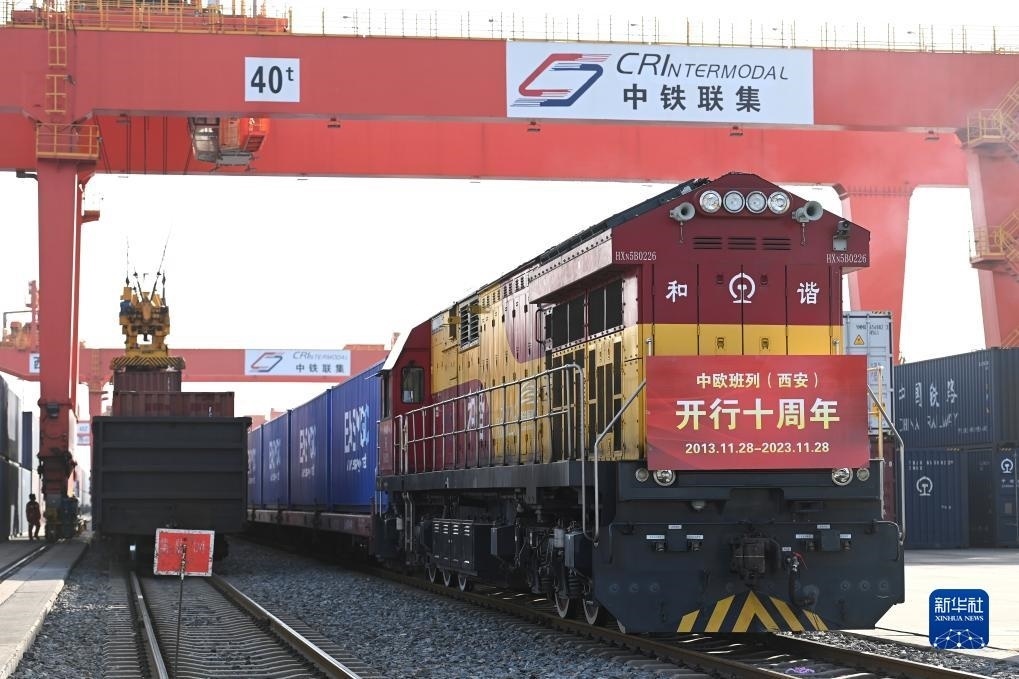 X8155次中歐班列在西安國際港站等待出發(fā)(2023年11月28日攝)。當(dāng)日,滿載貨物的X8155次中歐班列從西安國際港站開往德國漢堡,標(biāo)志著中歐班列(西安)自2013年11月28日開行首趟以來,已累計(jì)開行十周年。新華社記者 鄒競一 攝
