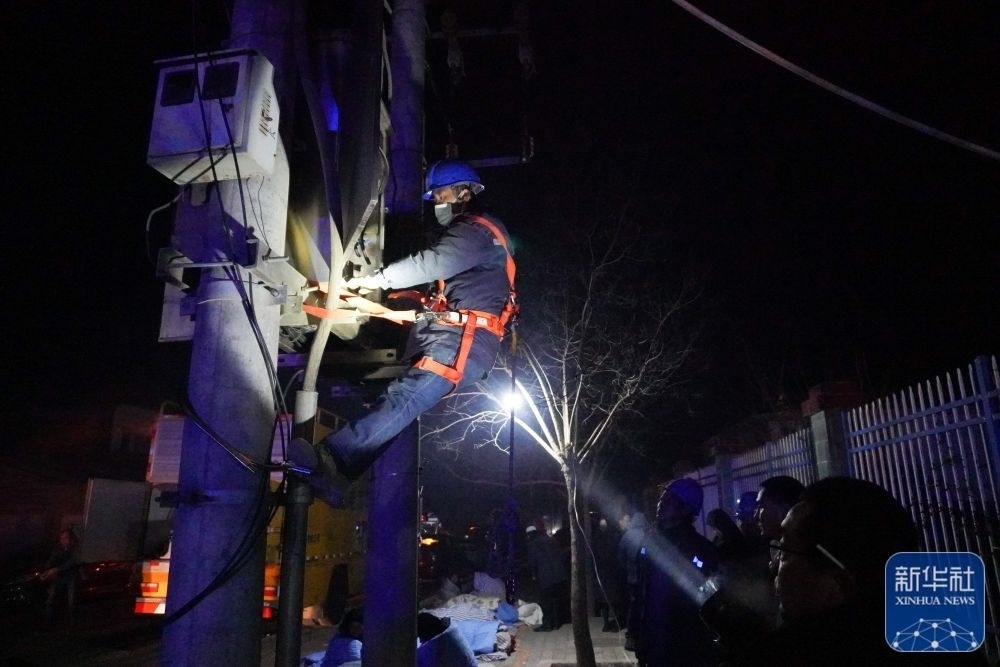 12月19日,在甘肅省臨夏回族自治州積石山保安族東鄉(xiāng)族撒拉族自治縣中西醫(yī)結(jié)合醫(yī)院門口,電力部門工作人員搶修電力設施。新華社記者 馬希平 攝