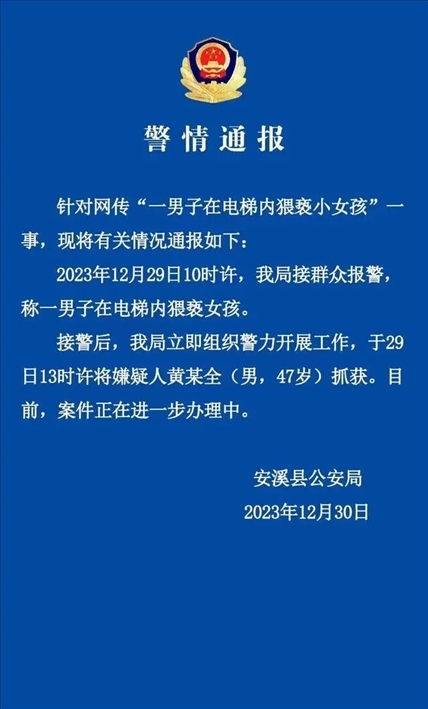 ·網傳“一男子在電梯內猥褻小女孩”,福建安溪警方:47歲男子被抓獲。