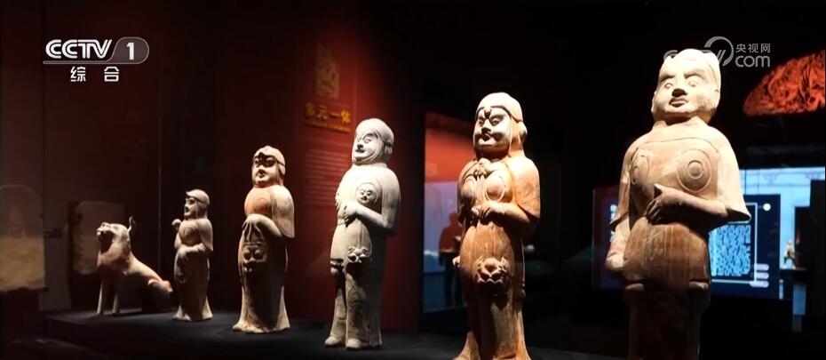 帶著濃濃異域風情的還有晉陽古城遺址出土的列隊成陣的駱駝俑、胡人俑。專家表示,這些文物都反映出古代絲綢之路上,晉陽曾是東西方文明交流十字路口的重要古城。在展出的1000多件文物中,唐代郭行墓壁畫也十分引人注目,墓主郭行曾追隨唐太宗李世民,是一名武將。
