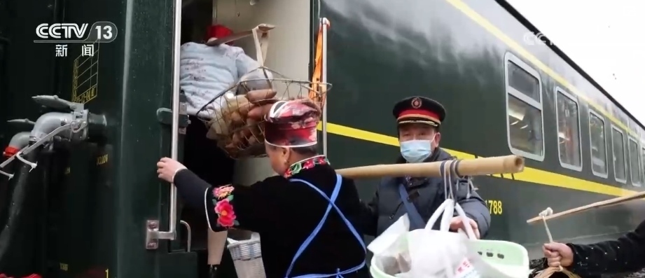 這趟“慢火車”,是鄉(xiāng)親們走親訪友的“幸??燔嚒保前汛笊嚼锏霓r(nóng)特產(chǎn)品送到山外售賣的“致富快車”。新春臨近,列車上的農(nóng)特產(chǎn)品車廂變得熱鬧起來,村民們將自家的年貨拿上車售賣,車廂里喜氣洋洋。