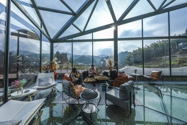 在獵神村礦咖民宿全景玻璃陽光室,山中風(fēng)景一覽無余。熊偉攝