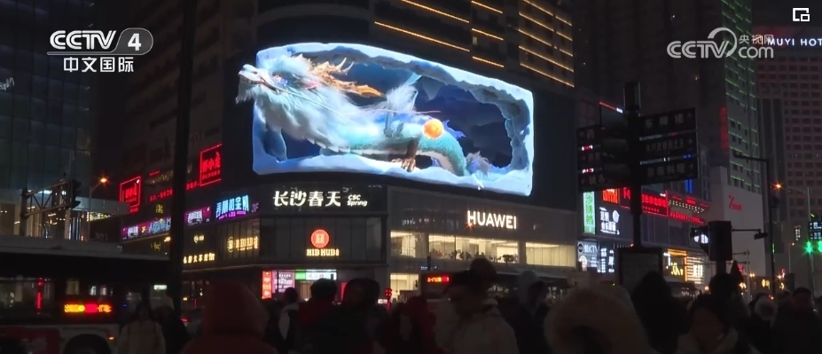 隨著夜幕降臨,在上海市南京西路這家商場戶外大屏,在裸眼3D技術(shù)的加持下,一條靈動(dòng)時(shí)尚的“光影巨龍”騰飛而出。同時(shí),上海南京西路商圈的多個(gè)地標(biāo)建筑,也開啟了春節(jié)燈光演繹。