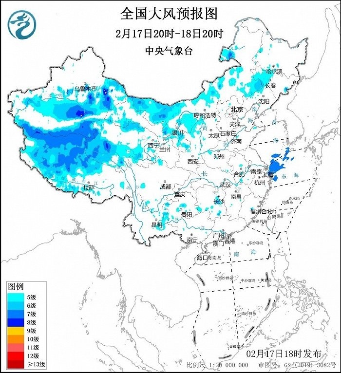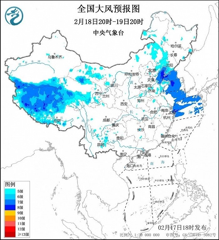 2月18日20時(shí)至19日20時(shí),西藏中西部、青海南部、甘肅河西、內(nèi)蒙古西部和中部、遼寧西部和南部等地將有5~6級(jí)、陣風(fēng)7~9級(jí)的大風(fēng);渤海、渤海海峽、黃海大部海域、東海北部海域?qū)⒂?~8級(jí)、陣風(fēng)9~10級(jí)的大風(fēng)。