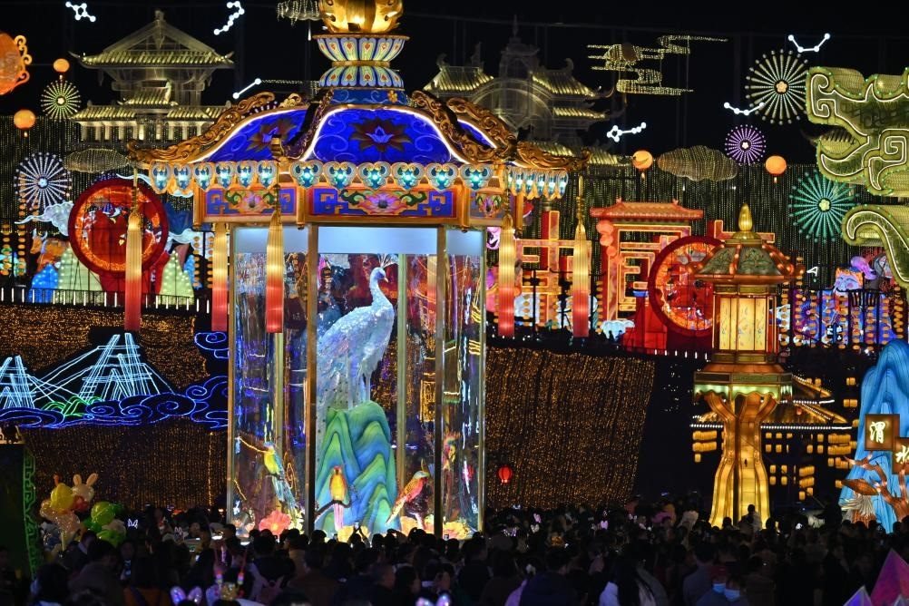在四川自貢,3萬(wàn)多名游客走進(jìn)“中國(guó)燈城”自貢中華彩燈大世界,觀彩燈、賞演藝、拍全家福。空中,600架無(wú)人機(jī)排列出湯圓、舞龍燈等圖樣;地面,舞龍舞獅等民俗表演輪番上演,上百名身著漢服的演員手提花燈巡游……