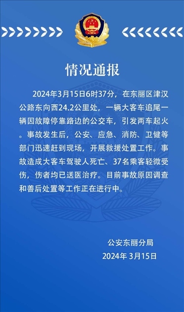 ·天津一輛大客車(chē)追尾一輛因故障??柯愤叺墓卉?chē),引發(fā)兩車(chē)起火,事故造成大客車(chē)駕駛?cè)怂劳觥?7名乘客輕微受傷。
