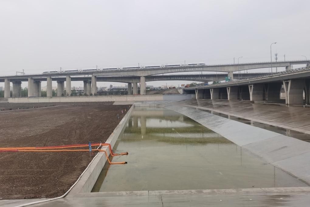 永定河京港澳高速公路大橋南,大寧調(diào)蓄水庫水毀修復(fù)工程施工現(xiàn)場,記者看到,新建的消力池已經(jīng)建好,所有實體工程已經(jīng)完工,一些工人正在做收尾清理工作。