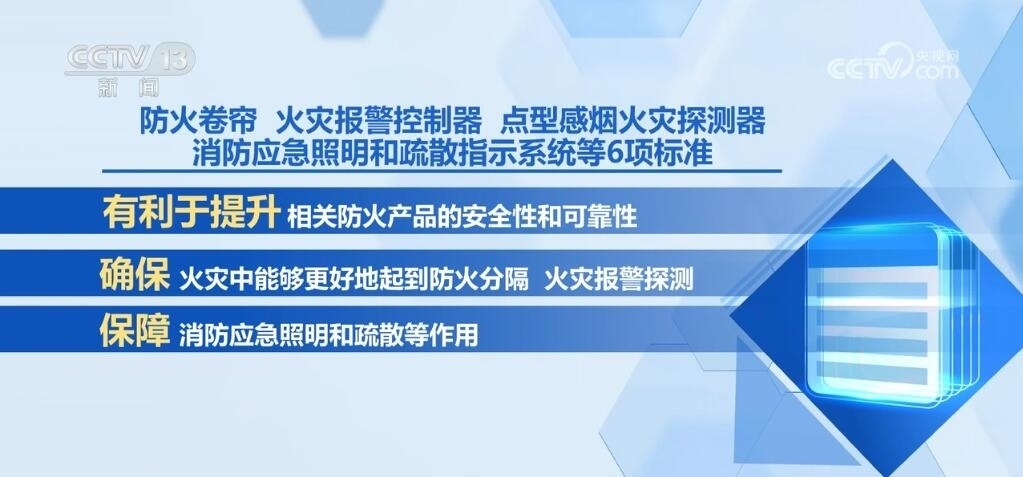 防火卷簾、火災(zāi)報警控制器、點型感煙火災(zāi)探測器、消防應(yīng)急照明和疏散指示系統(tǒng)等6項標(biāo)準(zhǔn)有利于提升相關(guān)防火產(chǎn)品的安全性和可靠性,確保其在火災(zāi)中能夠更好地起到防火分隔、火災(zāi)報警探測,保障消防應(yīng)急照明和疏散等作用。應(yīng)急避難場所、救災(zāi)帳篷等4項標(biāo)準(zhǔn)可確保受災(zāi)人員得到更安全、更舒適的臨時安置。