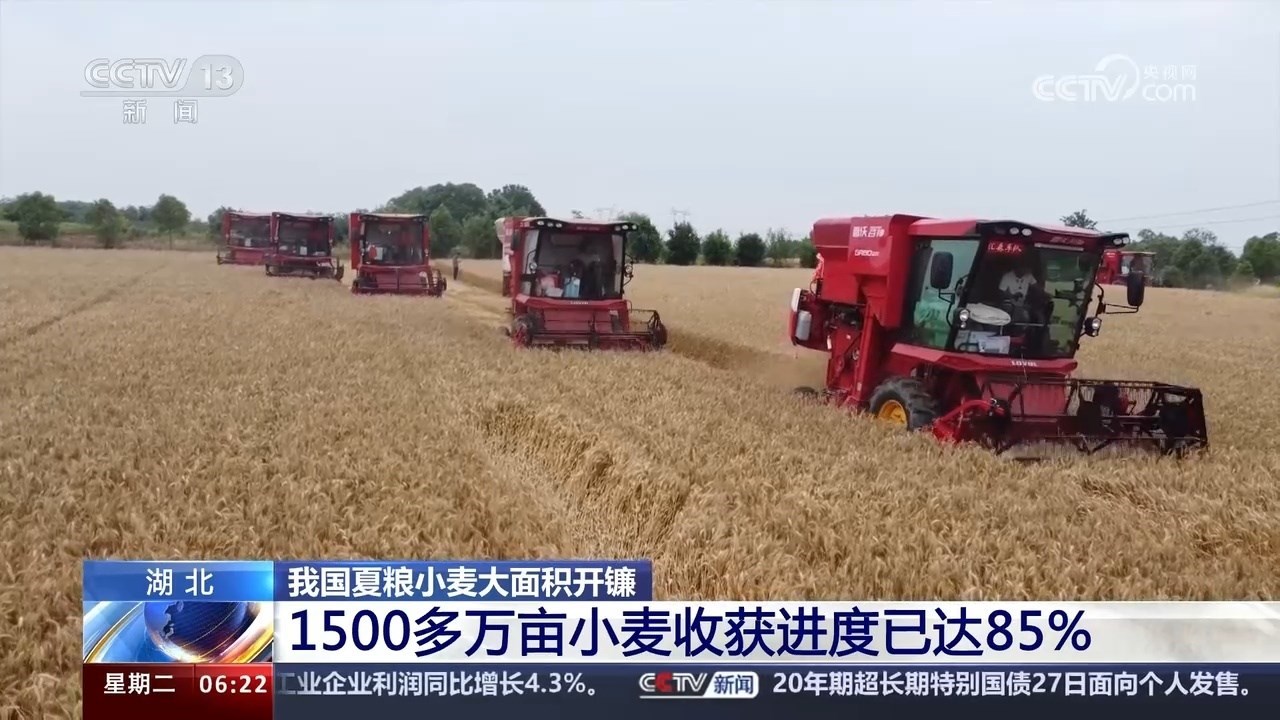 記者從湖北省農(nóng)業(yè)農(nóng)村廳了解到,截至5月26日,湖北省1500多萬畝小麥?zhǔn)斋@進(jìn)度達(dá)85%。