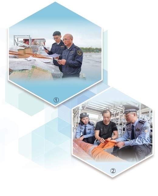 圖①:上海海關(guān)所屬松江海關(guān)工作人員檢查貨物。上海海關(guān)致力打造通關(guān)手續(xù)更簡便、通關(guān)效率更快捷、監(jiān)管更嚴(yán)密有效的營商環(huán)境。姜輝輝攝(人民視覺) 圖②:江蘇南通通州區(qū)公安局西亭派出所民警走進(jìn)生產(chǎn)車間,了解企業(yè)情況,護(hù)航企業(yè)經(jīng)營發(fā)展。翟慧勇攝(人民視覺)