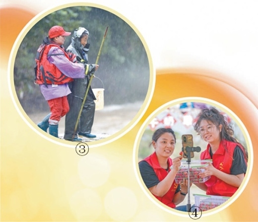 圖③:安徽省歙縣山越救援隊黨員(左)在轉(zhuǎn)移受災(zāi)群眾。樊成柱攝(影像中國) 圖④:新疆維吾爾自治區(qū)烏蘇市黨員志愿者到田間地頭直播銷售草莓。李仁錫攝(影像中國)
