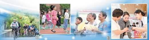 圖①:河北邯鄲市復(fù)興區(qū)沁河源景區(qū),騎行愛好者在騎行。聶長青攝 圖②:河南洛陽市瀍河回族區(qū)君河灣小學(xué),暑期托管班的學(xué)生在跳繩。李衛(wèi)超攝 圖③:安徽合肥市蜀山區(qū)小廟鎮(zhèn)五十墩社區(qū)文化廣場,村民在看戲曲演出。陳三虎攝 圖④:內(nèi)蒙古鄂爾多斯市康巴什區(qū)寧馨社區(qū)政務(wù)便民服務(wù)站,工作人員幫居民辦業(yè)務(wù)。王 正攝