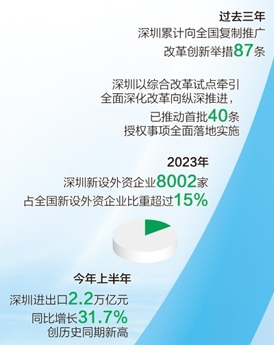 改革開放釋放澎湃動能。深圳發(fā)布支持外商投資生物醫(yī)藥領域、實施跨境貿(mào)易投資高水平開放政策試點等20條措施,出臺優(yōu)化國際化營商環(huán)境工作方案,持續(xù)提升對全球優(yōu)質要素資源的強大吸引力。去年全年,深圳新設外資企業(yè)8002家,占全國新設外資企業(yè)比重超過15%;今年上半年,深圳進出口總額2.2萬億元,同比增長31.7%,創(chuàng)深圳歷史同期新高。