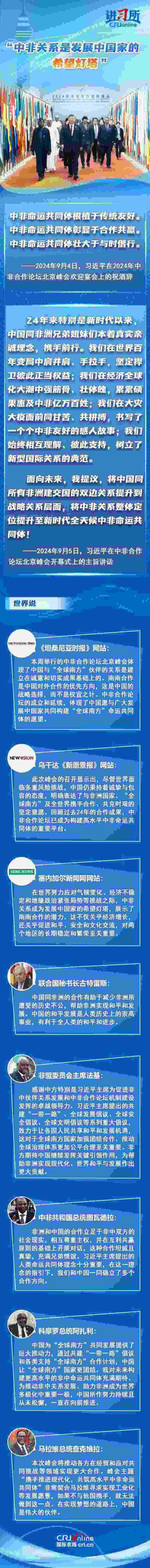 從宣布建立“新型伙伴關(guān)系”,到整體定位提升至“新時(shí)代全天候中非命運(yùn)共同體”,成立24年的中非合作論壇不斷推動(dòng)中非關(guān)系實(shí)現(xiàn)跨越式發(fā)展,特別是新時(shí)代以來,中國本著真實(shí)親誠理念,同非洲兄弟姐妹們攜手前行,受到非方廣泛稱贊。非方各界認(rèn)為,為推動(dòng)非中關(guān)系發(fā)展、助力非洲成為世界多極化中重要一極,中國所作努力持續(xù)且從未松懈,中非關(guān)系是發(fā)展中國家的希望燈塔。