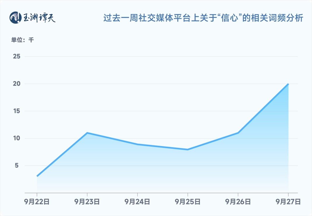 從這張曲線圖上可以看到,輿論場對“中國經(jīng)濟(jì)”的討論,在過去一周經(jīng)歷了2個峰值。其中,“信心”這個詞出現(xiàn)的頻率經(jīng)歷了兩次躍升。