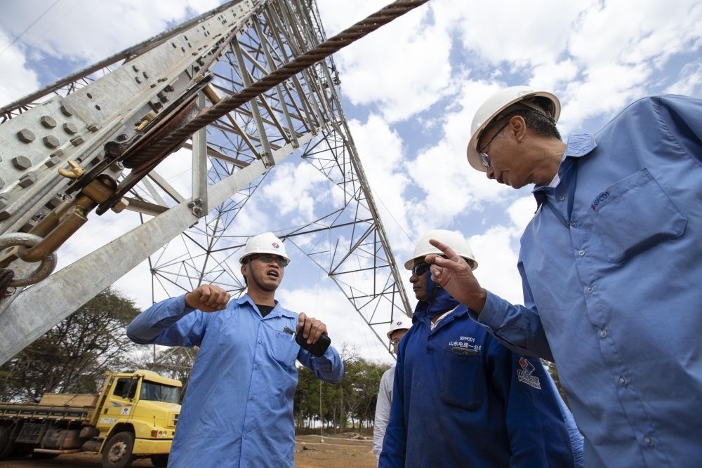 2018年8月7日,在巴西東南部米納斯吉拉斯州阿科斯市附近,巴西美麗山特高壓輸電工程二期第九標段項目中方現(xiàn)場施工管理負責人(左)在施工現(xiàn)場指導(dǎo)巴方員工。美麗山水電站二期項目是中國國家電網(wǎng)公司首個在海外獨立投資、建設(shè)和運營的特高壓直流輸電工程,也是“特高壓+清潔能源”在拉美的示范工程。
