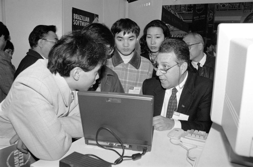 1995年12月14日,巴西外貿(mào)及合資項目洽談會在上海舉行。這是一位參展商向參觀者介紹巴西電腦網(wǎng)絡(luò)系統(tǒng)軟件設(shè)備。