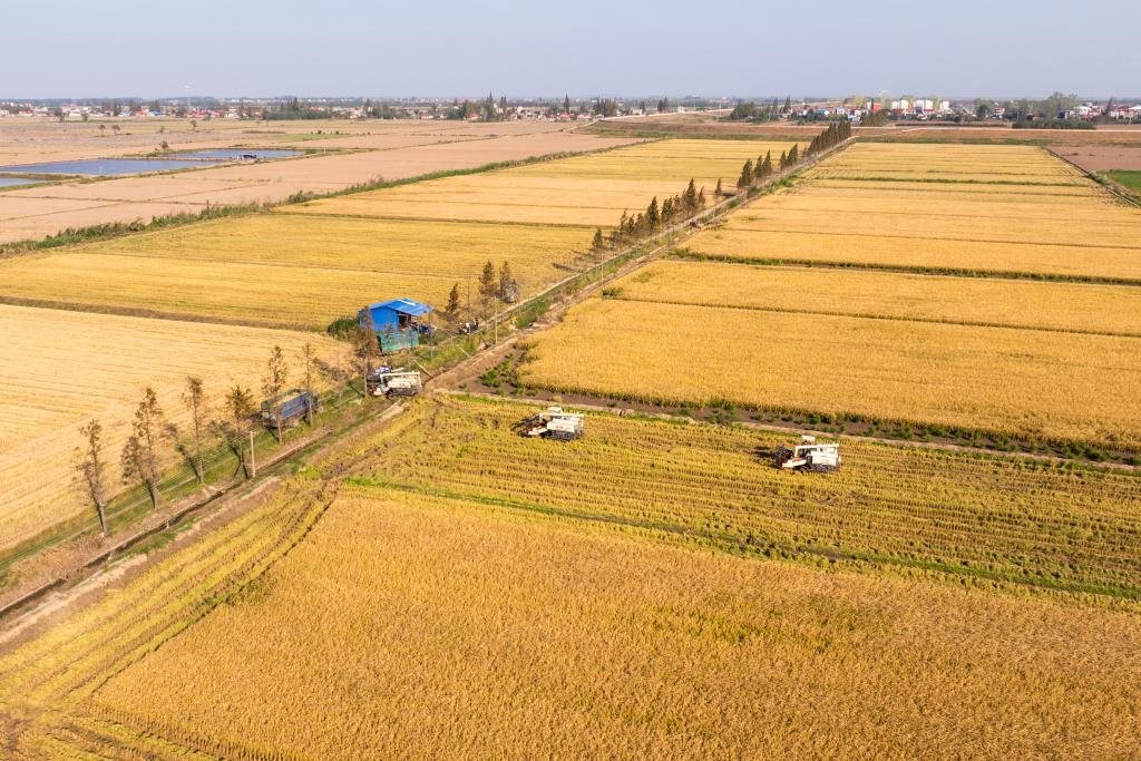 在湖南省岳陽市華容縣團(tuán)洲垸,村民駕駛收割機(jī)收獲水稻(2024年11月1日攝,無人機(jī)照片)。新華社記者 陳思汗 攝