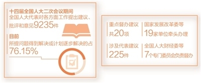 據(jù)全國(guó)人大常委會(huì)代表工委負(fù)責(zé)人介紹,十四屆全國(guó)人大二次會(huì)議期間,全國(guó)人大代表依法履職盡責(zé),對(duì)各方面工作提出建議、批評(píng)和意見(jiàn)9235件,交由213家承辦單位研究辦理,其中,重點(diǎn)督辦建議共20項(xiàng)。